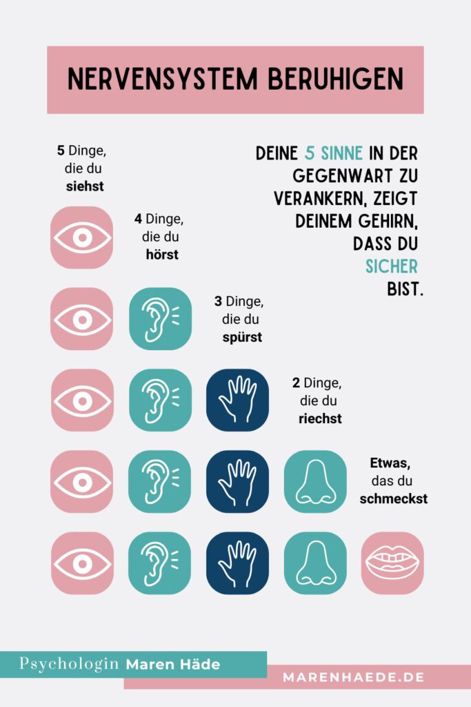 Das kann vielfältig aussehen. Den Körper können wir durch Atemübungen, achtsame Bewegungen, Entspannungsübungen beruhigen. Für mentale Sicherheit sorgen Übungen, die dir helfen, deine 5 Sinne zu aktivieren und dadurch wieder im Hier und Jetzt anzukommen.