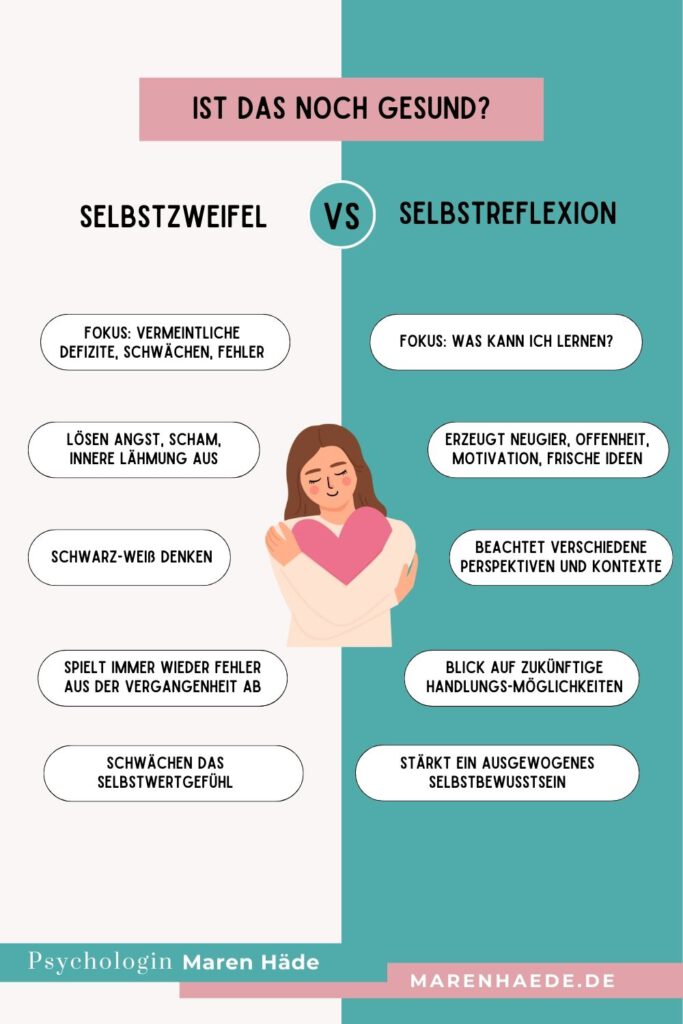 Wer sich selbst reflektiert, denkt ausgewogen sowohl über seine Stärken, als auch über Fehler und Schwächen nach. Wer grübelt, gerät jedoch oft in eine negative Spirale, in der immer mehr Gedanken an negative Situationen entstehen. Das hält Selbstzweifel aufrecht und kann sie noch verstärken (1).